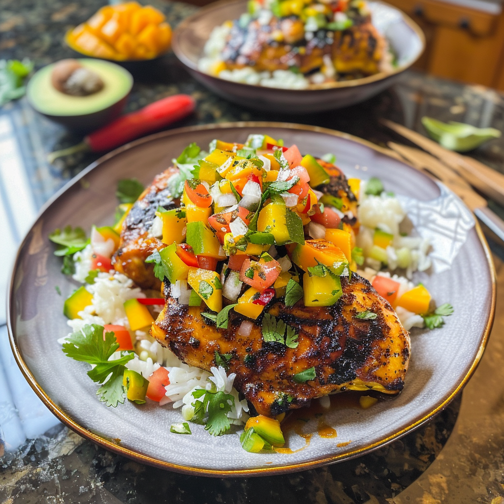 Serving Phase: Once your chicken is cooked through and juicy, remove it from the grill and let it rest for 5 minutes. Top each piece with a generous scoop of mango salsa before serving.