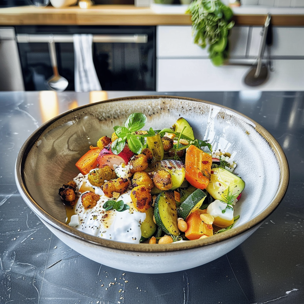Now sit back and admire your masterpiece—your Savory Yogurt Bowl with Roasted Vegetables is ready!